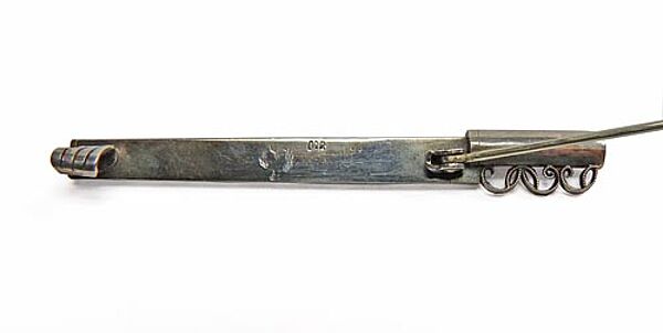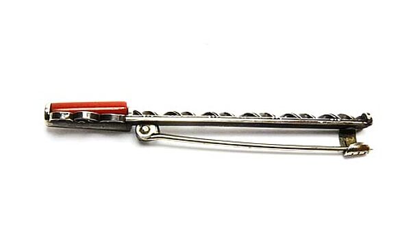 Aufwendig handgearbeiteter, bandförmiger Silberkorpus (800er) mit aufgesetzter feiner Spirale, an dessen einer Seite eine stabförmig geschliffene Koralle ansetzt. Hier sind unterseitig drei filigrane Schlaufenelemente angesetzt. Länge ca. 6,1 cm, ungeputzter Zustand mit deutlicherer Patina und geringen Tragespuren. Rückseitig einfache Broschierung. Ungemarkt, wohl Deutschland der 20er Jahre.