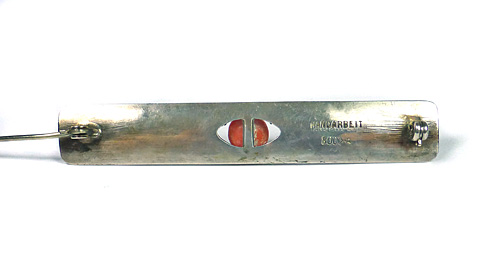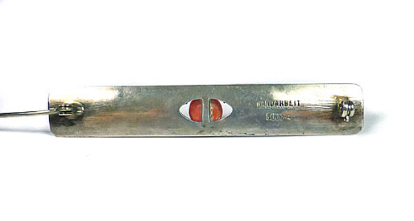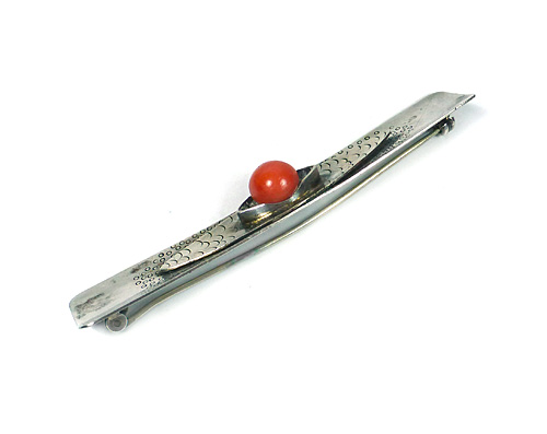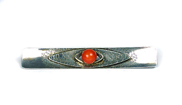 Handgefertigter, bandförmiger Silberkorpus (800er). Mittig ist ein flaches, spindelförmiges Element aufgesetzt, welches zentral eine spindelförmige, mit einem kleinen Steg versehene Öffnung aufweist, die teilweise durch eine rückseitig gestiftete Korallenperle ausgefüllt wird. Vorderseitig ist partiell ein gepunztes Punkte- bzw. Ringedekor aufgebracht. Länge ca. 7,2 cm, Breite ca.1,2 cm, ungeputzter Zustand mit leichter Patina und geringen, allenfalls moderaten Tragespuren. Rückseitig Sicherheitsverschluss mit Kugelkopf und Bezeichnung "Handarbeit". Ungemarkt, wohl Deutschland der 1920er Jahre.