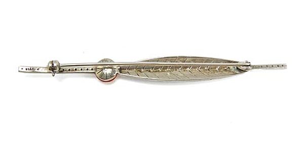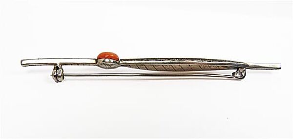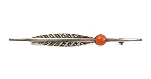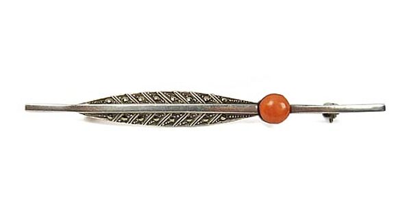 Der elegante, längliche Silberkorpus (935er) wird durch eine zentrale, stabförmige Komponente dominiert, welche einen asymmetrisch angeordneten Korallen-Cabochon in Zargenfassung integriert und ein mit Markasiten besetztes, feder- bzw. blattartiges Element halbiert. Länge ca. 8,5 cm, ungeputzter Zustand mit geringen Tragespuren. Rückseitig Sicherheitsbroschierung mit Kugelkopf. Ungemarkt, wohl Deutschland der 1920er Jahre.