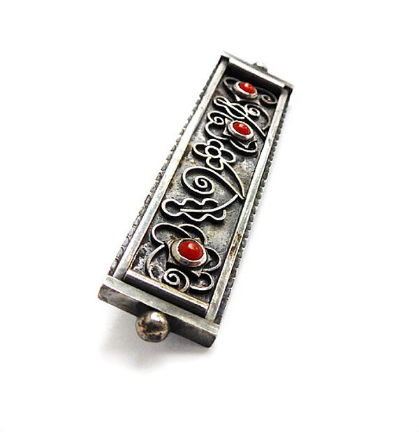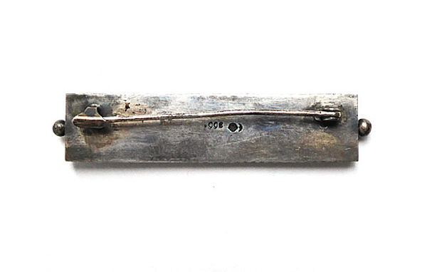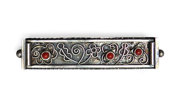 Bandförmiger Silberkorpus (800er), wobei ein schmaler Rahmen ein durch aufgelegte Stege dargestelltes, leicht stilisiertes Blumen- und Blattdekor umschließt. Im Zentrum der Blüten sind drei kleine Korallen-Cabochons in Zargenfassung integriert, seitlich ist jeweils ein kleines Kugelelement angesetzt. Länge ca. 5,6 cm, Breite ca. 1,2 cm, ungeputzter Zustand mit moderater, dunkler Patina und leichten Tragespuren. Rückseitig einfache Broschierung. Wohl Deutschland der 1920er, 30er Jahre.