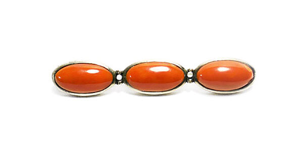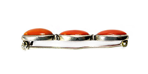 Silberner Korpus (835er), der sich aus einer Reihe von drei miteinander verbundenen, durch kleine ringförmige Zwischenglieder separierten, zargengefassten, querovalen, lachsroten Korallen-Cabochons zusammensetzt. Länge ca. 5,3 cm, geringe bis allenfalls moderate Tragespuren. Rückseitig Sicherheitsbroschierung mit Kugelkopf. Ungemarkt, wohl Deutschland der 1920er Jahre.