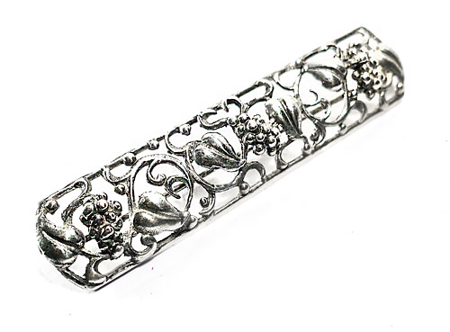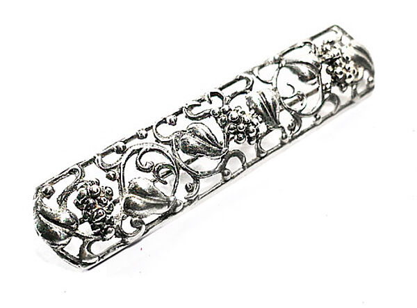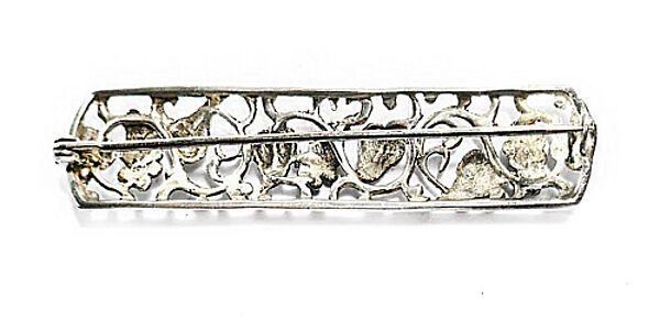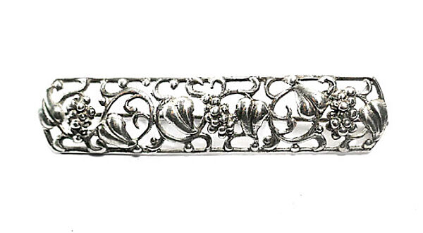 Annähernd rechteckiger bzw. bandförmiger Silberkorpus (geprüft) mit abgerundeten schmalen Seiten. Ein außen umlaufender schmaler Steg umfasst ein plastisch fein ausgearbeitetes florales Durchbruchdekor (Blätter und Beeren oder Trauben). Maße ca. 6,5 x 1,5 cm, ungeputzter Zustand mit leichten Tragespuren. Rückseitig einfache Broschierung. Ungemarkt, wohl Deutschland der 1910er, 20er Jahre.