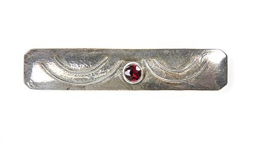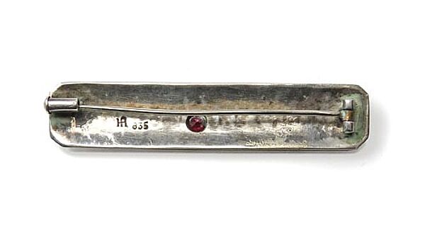 Handgetriebener, bandförmiger, leicht konvexer Silberkorpus (835er) mit feinem Hammerschlag. Mittig roter, facettierter Stein (Rubin? Granat?) in Zargenfassung. Jeweils seitlich hiervon sind zwei untereinander liegende, feine, bogenförmige Stege aufgesetzt. Maße ca. 5,2 x 1,2 cm, Durchmesser des Steines ca. 5 mm, ungeputzter Zustand mit geringen Tragespuren (Nadel leicht verbogen). Rückseitig Markung (ligiertes "HA", nicht aufgelöst) und Sicherheitsbroschierung mit schiebbarem Zylinderkopf. Wohl Deutschland der 20er, 30er Jahre.