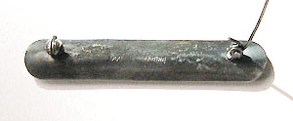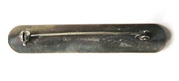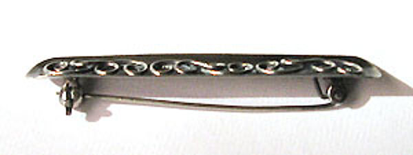 Bandförmiger, leicht gemuldeter Silberkorpus (900er) mit abgerundeten Ecken, aufgesetzte schlungenartige Elemente aus Silberdraht. Länge ca. 6 cm, ungeputzter Zustand mit gleichmäßiger Patina und geringen Tragespuren. Rückseitig Sicherheitsbroschierung mit Kugelkopf, Markung und Bezeichnung "HANDARBEIT". Wohl 30er bis 50er Jahre.