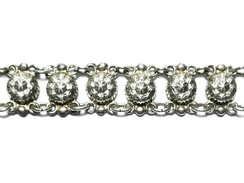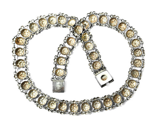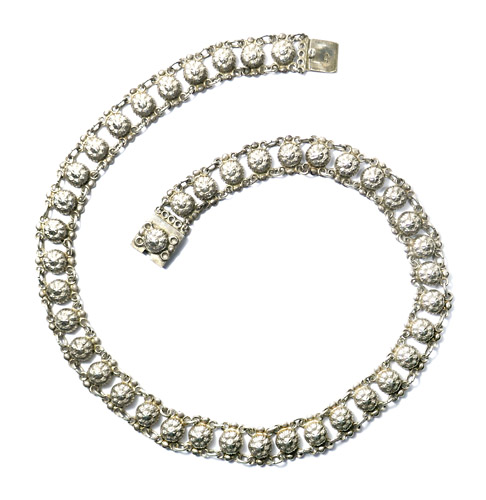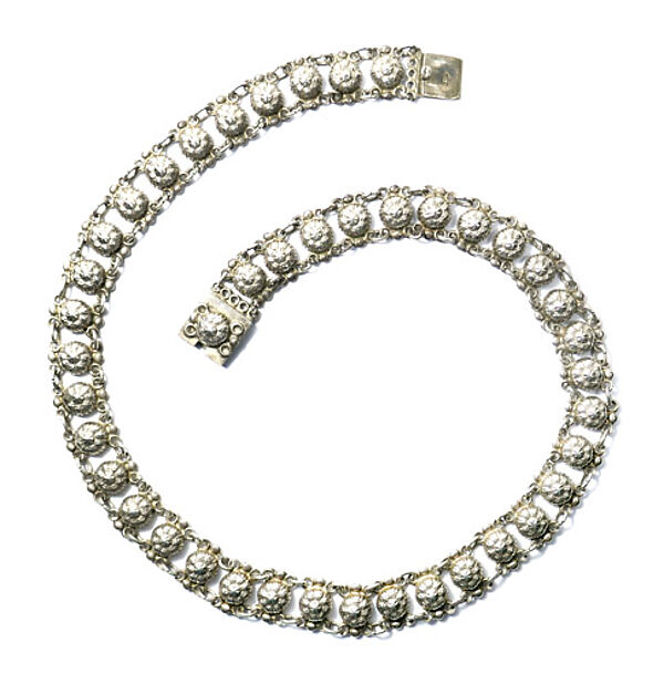 Silbernes Collier (830er) mit verdecktem Kastenschloß mit Federzunge. Die einzelnen, durch kleine starre und bewegliche Ösen miteinander verbundenen, plastisch geprägten Glieder haben die Form einer stilisierten Blüte. Länge ca. 42 cm, ungeputzter Zustand mit leichten Tragespuren. Wohl Deutschland der 1920er bis 40er Jahre.
