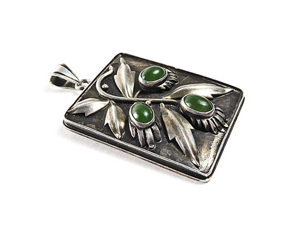 Der handgearbeitete Silberkorpus (800er) wird durch eine hochrechteckige, schmal umrandete Platte gebildet, deren Vorderseite ein stilisierter, plastisch ausgearbeiteter Blütenzweig aufgesetzt wurde. Hierbei stellen drei ovale, grüne Schmuckstein-Cabochons (Achate?) in Zargenfassung die Blüten dar. Oberseitig befindet sich eine dreieckig konfigurierte, bewegliche Öse. Maße 3,7 x 3 cm, Länge mit Öse ca. 5 cm. Ungeputzter Zustand mit z.T. dunkler Patina und geringen Tragespuren. Ungemarkt, wohl Deutschland der 1920er Jahre.