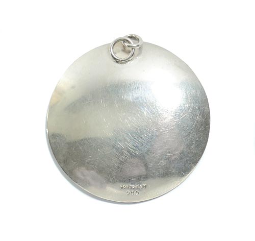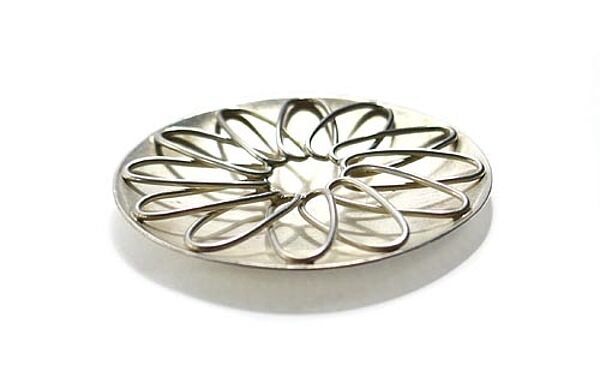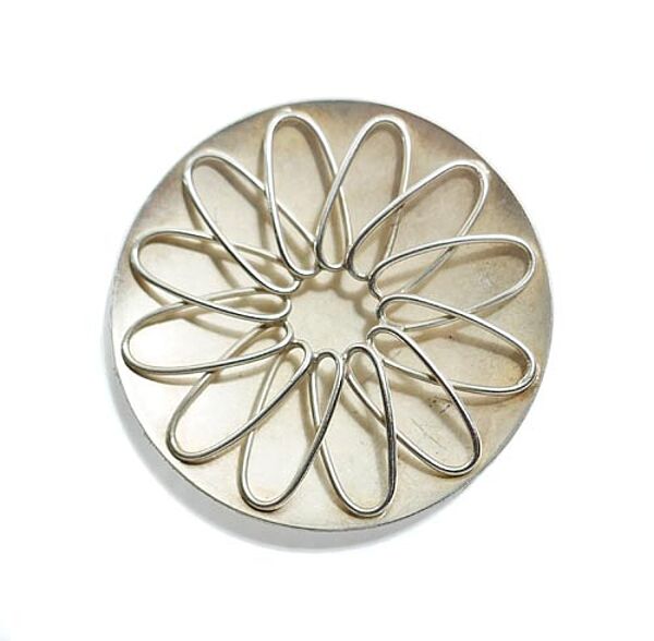 Silberner Korpus (900er) in Form einer flach gemuldeten Scheibe. Dieser ist ein zartes Drahtgeflecht in Form einer stilisierten Blüte aufgelegt. Am oberen Rand der Rückseite ist eine eine bewegliche Öse angebracht, am unteren Rand bezeichnet "Handarbeit". Durchmesser ca. 3,8 cm, geputzter Zustand mit geingen Tragespuren. Wohl Deutschland der 1940er bis 60er Jahre.