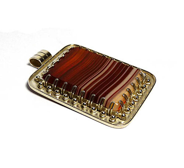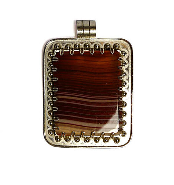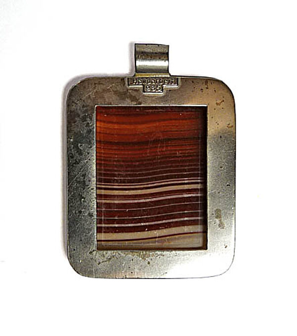 Hochrechteckiger, silberner Korpus (935er), der vorderseitig durch eine krappengefasste Achatplatte dominiert wird. Oberseitig breite, starre Öse. Maße ca. 4,5 x 3,7 cm, Länge mit Öse ca. 5,3 cm, ungeputzter, z.T. etwas patinierter, vermutlich ungetragener Zustand. Rückseitig bezeichnet "Handarbeit", ungemarkt, aber quasi identischer und hier aber gemarkter Entwurf wie Art.Nr. 4200, wohl 1930er Jahre.