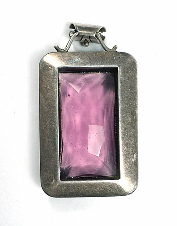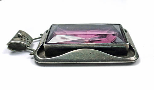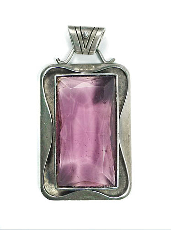 Hochrechteckiger Silberkorpus (835er), der mittig einen großen, facettiert geschliffenen Schmuckstein (wohl Amethyst) in freigestellter Zargenfassung trägt. Oberseitig befindet sich eine dominate, mit einem feinen Steg an den Korpus angesetzte, bewegliche, sich nach unten verjüngende Öse, die vorderseitig ein kleines, knopfartiges Zierelement trägt. Maße ca. 4 x 2,8 cm, Länge mit Öse ca. 5,2 cm, Stein ca. 3 x 1,6 cm, ungeputzter Zustand mit moderater Patina und geringen Tragespuren. Ungemarkt, wohl Deutschland der 1920er Jahre.