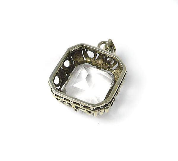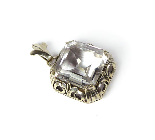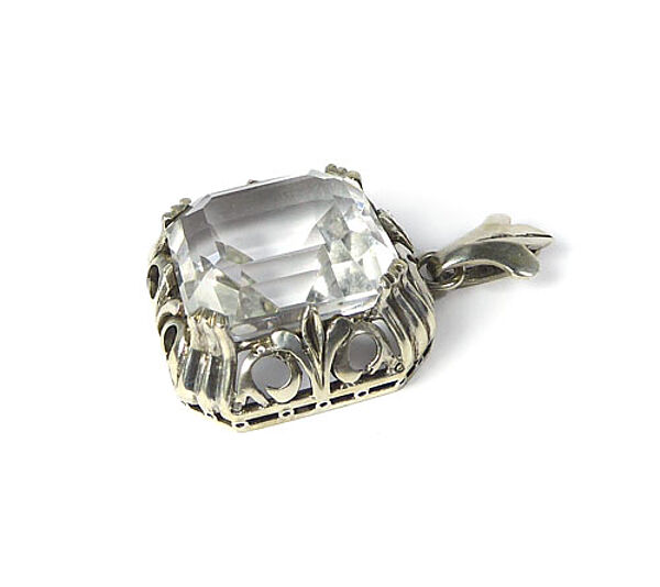 Offen gearbeiteter Silberkorpus (935er): im Randbereich stilisierte florale Elemente, mittig Krappen-gefasster, facettierter Bergkristall. Oberseitig bewegliche Öse in Form dreier verschmolzener Blätter. Maße ca. 2,5 x 2,5 cm, Steingröße ca. 2 x 1,8 cm, Länge mit Öse ca. 3,8 cm, alt geputzter Zustand, geringe Tragespuren. Wohl Deutschland der 1920er Jahre.