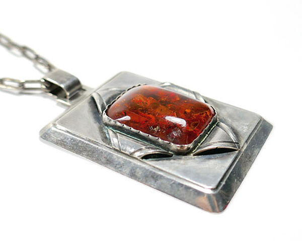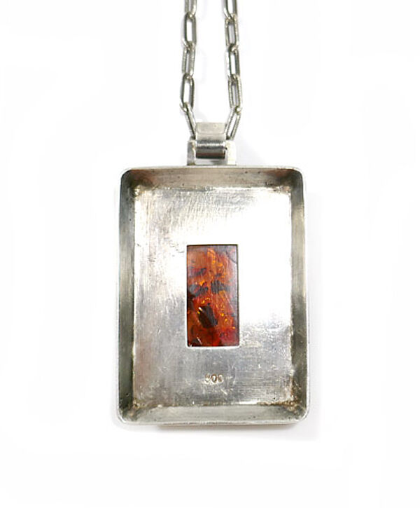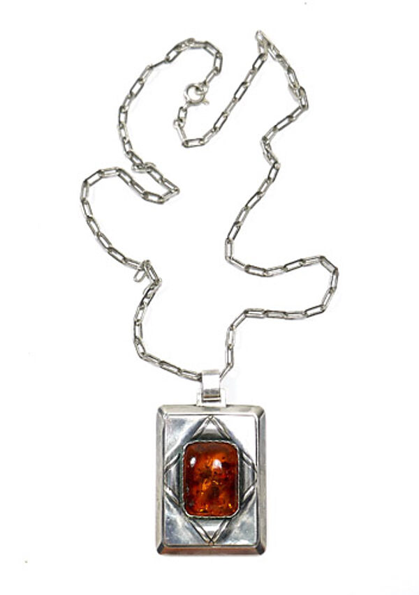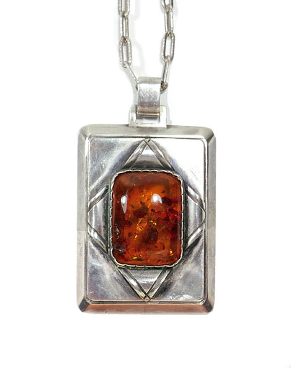 Handgefertigter, hochrechteckiger Anhängerkorpus aus Silber (800er), der vorderseitig mittig einen rechteckigen, orange-braunen, luziden, gemuggelten Bernsteincabochon mit kleinen vegetabilen Einschlüssen und abgerundeten Ecken in einer Zargenfassung trägt. Er wird eingerahmt von einer auf der Spitze stehenden Rhombus-Figur, die sich leicht erhaben von der Oberfläche absetzt. Oberseitig starre, eckige Anhängeröse durch die ein breites Ringelement zieht. Wohl original zugehörige Ankerkette mit Ringösenverschluss. Anhänger-Maße ca. 4,2 x 3,2 cm, Länge mit Anhängeröse ca. 5,2 cm, Kettenlänge ca. 51 cm, alt geputzter Zustand mit diskreter Patina und geringen Tragespuren. Ungemarkt, wohl Deutschland (Königsberg?) der 1920er, 30er Jahre.