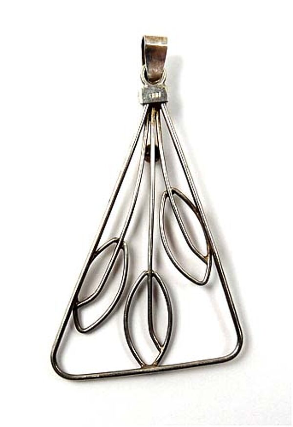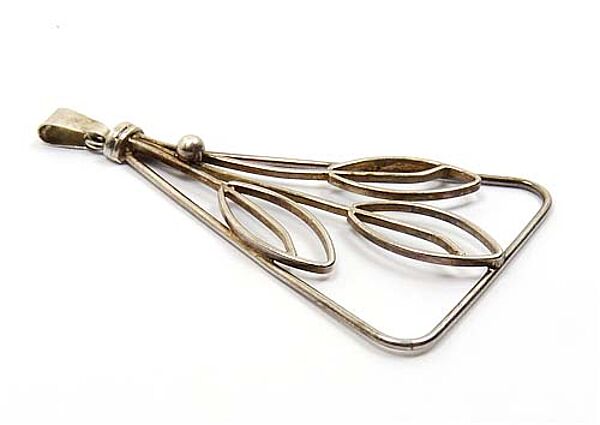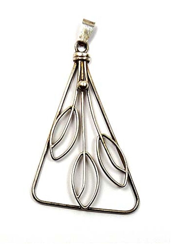 Handgefertigter, neusachlich anmutender, in der Grundform dreieckig konfigurierter Korpus aus filigranem Silberband (800er): ein Rahmen umfasst drei nach unten weisende, stilisierte Blätter. Oberseitig einfache, relativ breite Öse. In Höhe der Blattstiele aufgesetzte Silberkugel. Länge mit Öse ca. 6,5 cm, ungeputzter Zustand mit diskreter Patina und geringen Tragespuren. Ungemarkt, wohl Deutschland der 20er bis 40er Jahre.