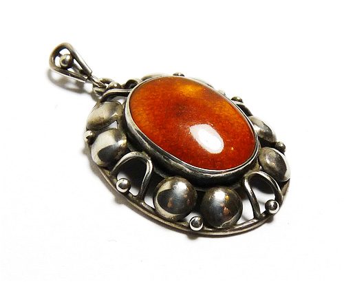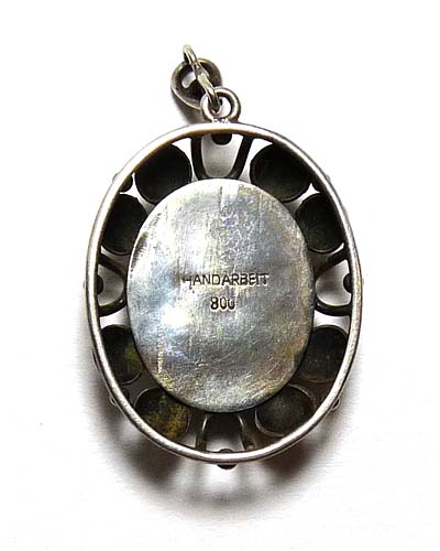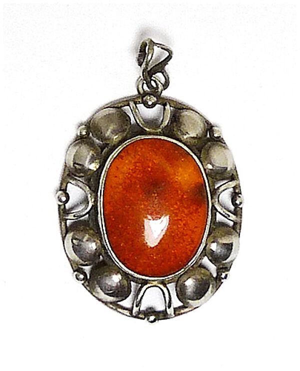 Ovaler, offen gearbeiteter Silberkorpus (800er) mit zentralem, bernsteinfarbenen Emaille-Cabochon in Zargenfassung, umrahmt von 4 x 2 schalenförmigen, 4 x 1 krampenartigen und 8 kleinen Kugel-Elementen. Oberseitig filigrane, gebogene Öse, hier ist ebenfalls eine kleine Silberkugel integriert. Länge mit Öse ca. 4,3 cm, Breite ca. 2,6 cm, ungeputzter Zustand mit geringen Gebrauchsspuren. Ungemarkt, rückseitig bezeichnet "HANDARBEIT", wohl Deutschland der 20er, 30er Jahre.