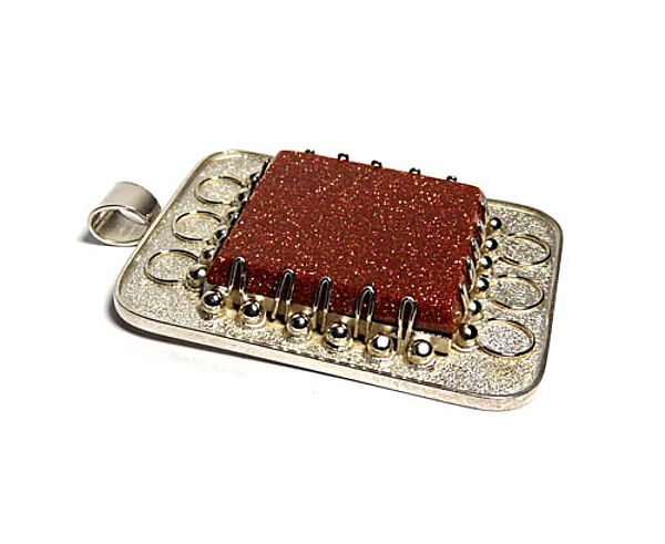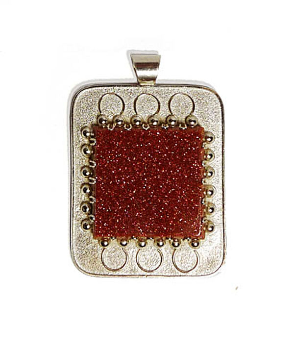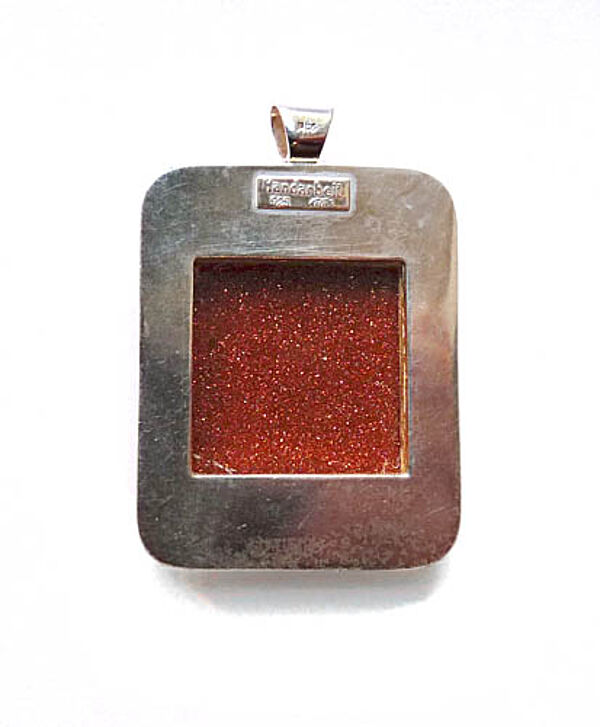 Hochrechteckiger, zentral offen gearbeiteter Silberkorpus (925er) mit abgerundeten Ecken, der vorderseitig eine quadratische, krappengefasste Goldfluss-Platte (=Aventuringlas) trägt, umgeben von kleinen Kugelelementen. Nach oben und unten wird die Platte von jeweils einer Reihe aus drei Ringelementen flankiert. Oberseitig ist eine starre, einfache, relativ breite, sich nach unten verjüngende Öse fixiert. Rückseitig gemarkt und bezeichnet "Handarbeit". Maße ca. 4,5 x 3,5 cm, Länge mit Öse ca. 5,2 cm, ungeputzter, vermutlich ungetragener Zustand. Rückseitig Markung, wohl 1930er Jahre.