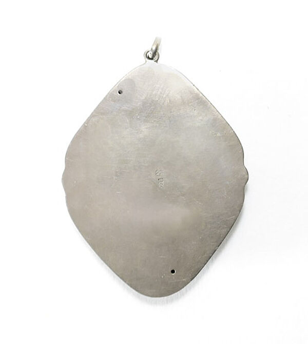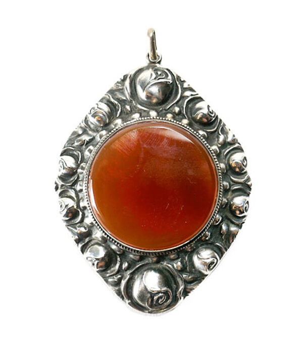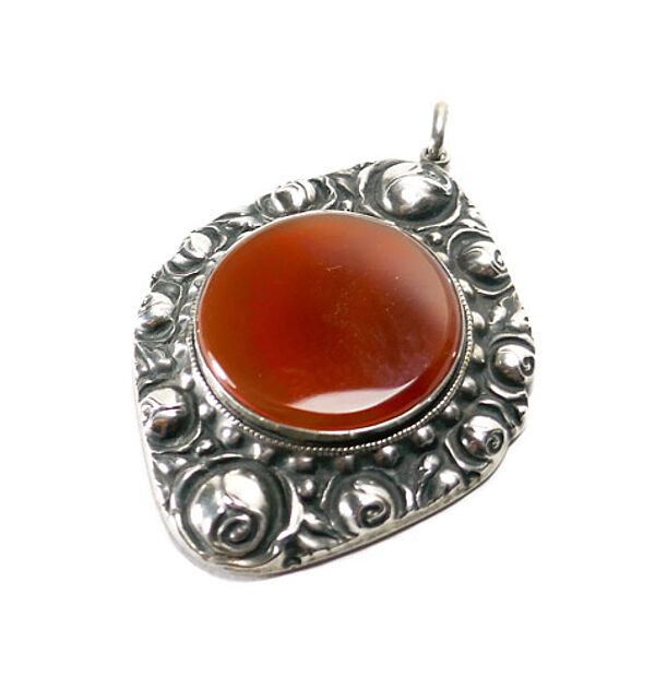 Spitz-ovaler Silberkorpus (800er) mit zentral scheibenförmigem Karneol in Zargenfassung, der von einem stilisierten Rosenrelief umgeben wird. Oberseitig einfache, runde Öse. Länge ca. 5 cm, ungeputzter Zustand mit deutlicherer Patina und geringen Tragespuren. Rückseitig gemarkt "KH" (ungedeutet), wohl Deutschland der 20er, 30er Jahre.