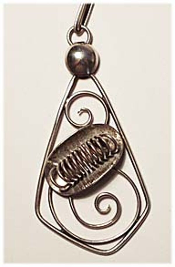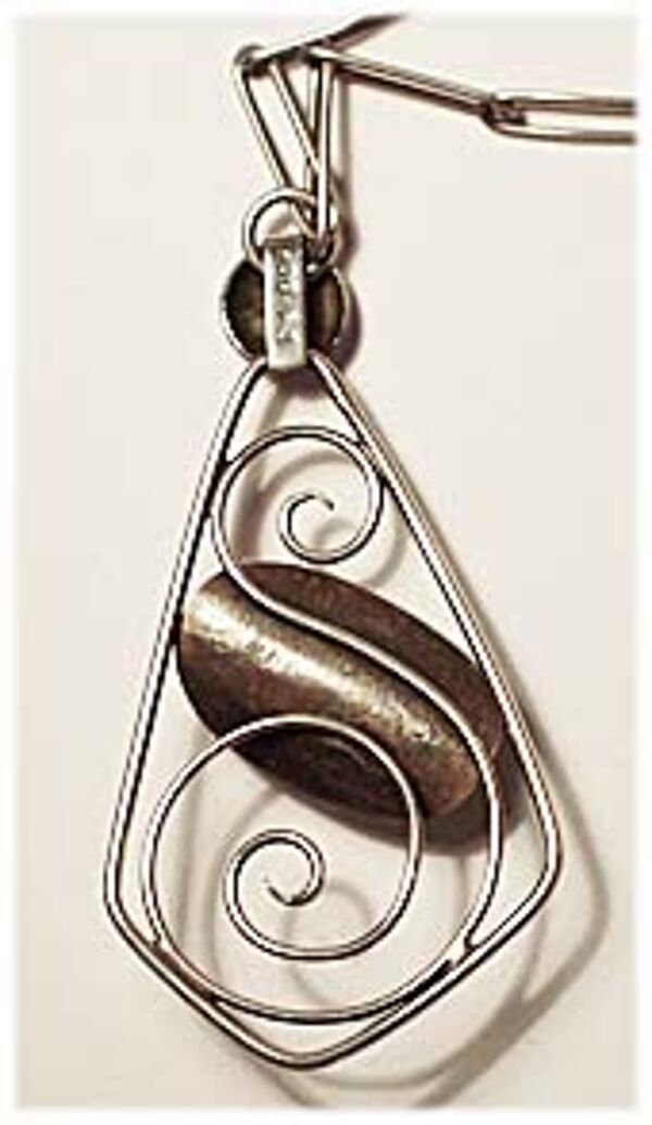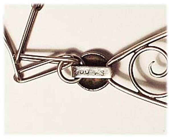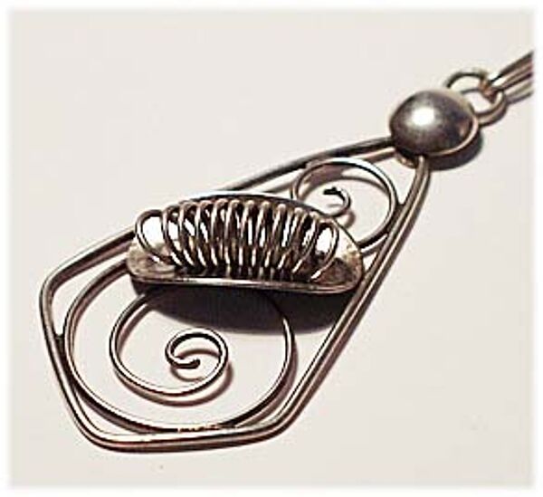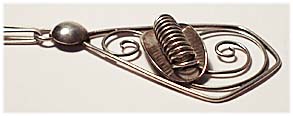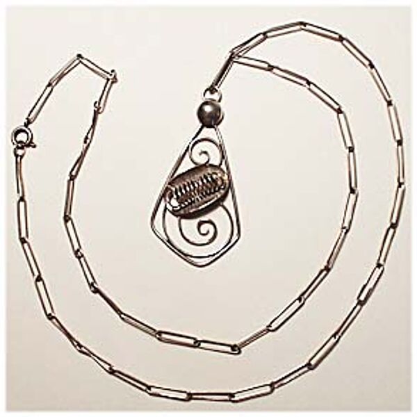 Angedeutet trapez-förmiger, offen gearbeiteter Korpus aus Silberdraht (900er) mit spiralförmigen, wohl stilisiert-floralen Zierelementen, Länge ca. 5,8 cm. An den Anhänger ist eine grobgliedrige Kette mit Ringösenverschluß fixiert (Länge ca. 63 cm). Ungeputzter Zustand. Rückseitig der Anhängeröse befindet sich neben der Punze eine Markung ("KS", ungedeutet), wohl Deutschland der 20er, 30er Jahre.