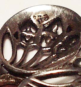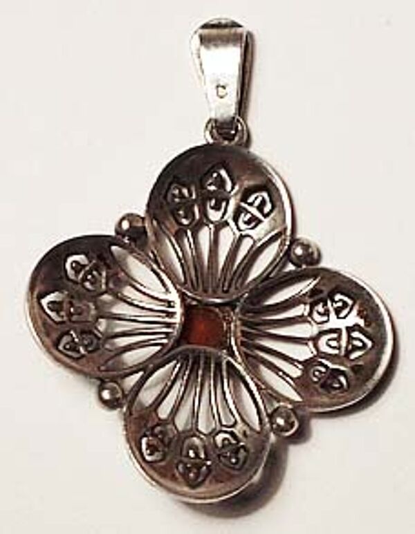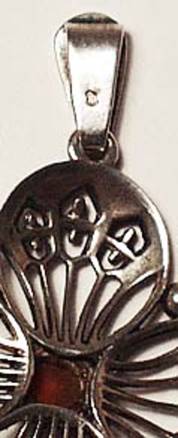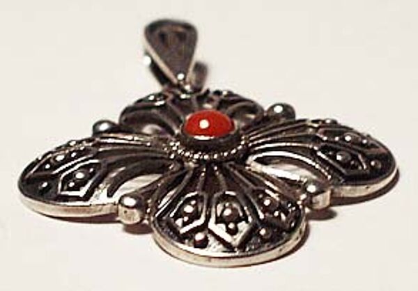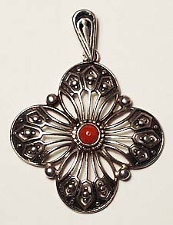 Offen gearbeiteter silberner Korpus (835er) in Form einer stilisierten Blüte, zentral befindet sich ein Korallen-Cabochon in Zargenfassung. Länge mit Aufhänger ca. 4,7 cm, ungeputzter Zustand mit minimalen Gebrauchsspuren. An der Öse ungedeutete Markung, wohl Deutschland der 1920er Jahre.