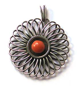 Der in der Grundform runde Silberkorpus (935er) setzt sich aus mehreren, dicht aneinander gereihten Drahtschlaufen zusammen, die ein zentrales schüsselförmiges Element umschließen, welches einen Korallen-Bouton trägt. Durchmesser ca. 3,5 cm (gemessen ohne Öse), ungeputzter Zustand mit geringen Gebrauchsspuren. Ungemarkt, wohl Deutschland der 1920er, 30er Jahre.