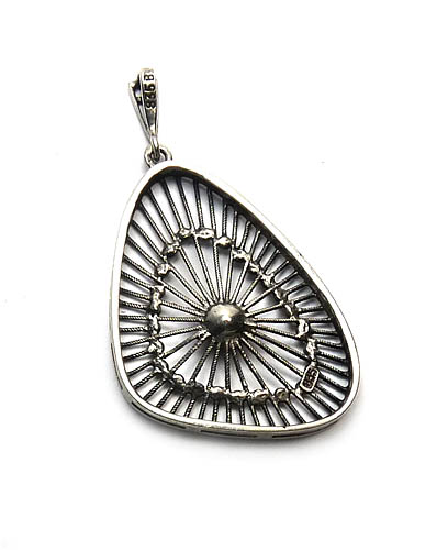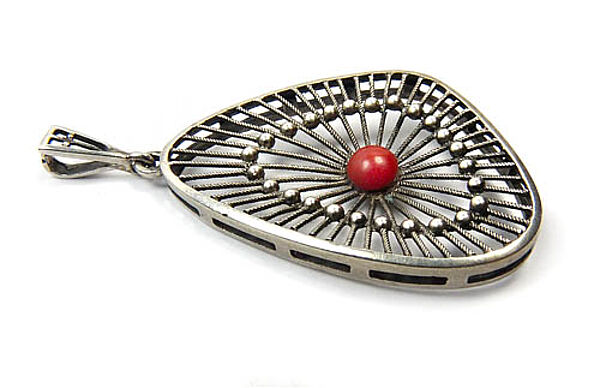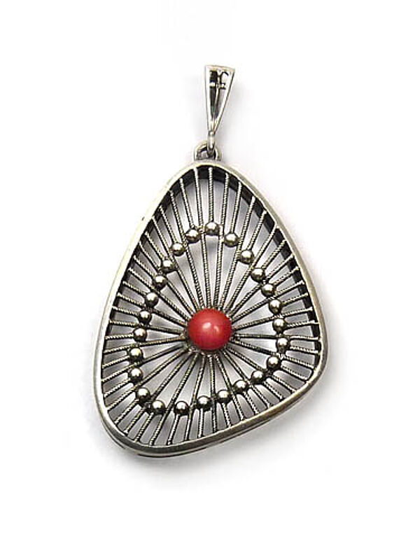 Annähernd dreieckiger, offen gearbeiteter Silberkorpus (835er) mit abgerundeten Ecken, wobei eine relativ kräftiges, seitlich teilweise geschlitztes Band einen Kranz aus feinen, strahlenförmig angeordneten, feinen Streben umschließt. Diese laufen in einem zentralen Punkt zusammen (hier ist eine leuchtend rote Korallen-Perle fixiert) und werden durch eine Reihe, perlschnurartig angeordneter Silberkügelchen separiert. Oberseitig schmale, längliche, teilweise durchbrochene, bewegliche Öse. Länge mit Öse ca. 5 cm, ungeputzter Zustand mit geringen Tragespuren. An der Öse gemarkt mit "B" (ungedeutet, im Verzeichnis deutscher Firmenstempel auf Schmuck und Luxuswaren sind gleich mehrere Hersteller gelistet, die mit einem einfachen "B" marken: Albrecht Thomas / Waldstetten; Behner & Co. / Pforzheim; Boehm Carl & Co. / Hanau), wohl Deutschland der 1920er bis 40er Jahre.
