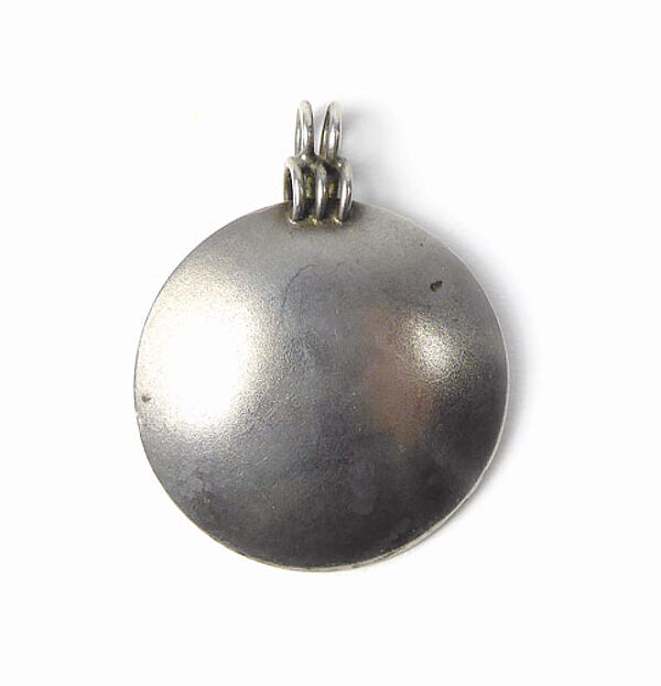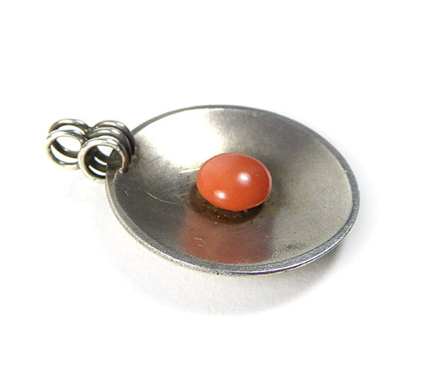 Silberner Korpus (geprüft) in Form einer flach gemuldeten Schale in derem Zentrum eine abgeflachte, lachsrote Korallenperle fixiert ist. Oberseitig aufwendige, doppelt angelegte und zweistöckig aufgebaute, starre Kettenöse. Durchmesser ca. 2,5 cm, ungeputzter Zustand mit leichter Patina und geringen Tragespuren. Ungemarkt, wohl Deutschland der 1920er bis 40er Jahre.