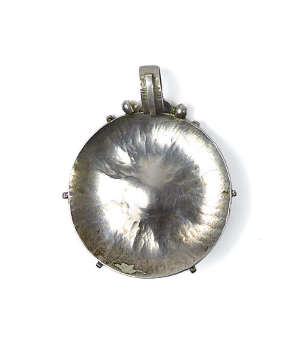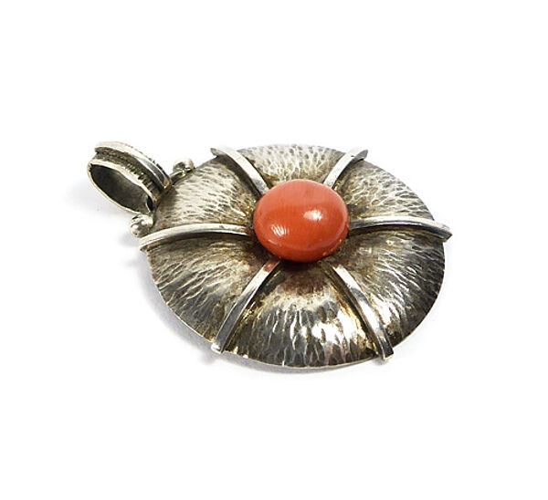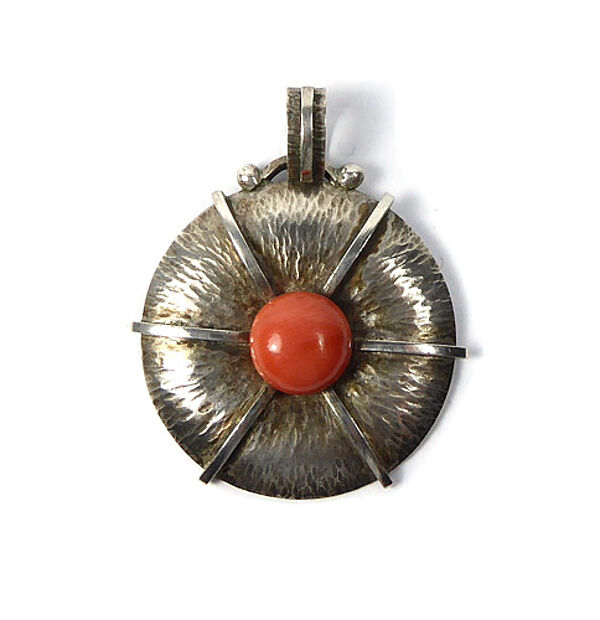 Handgetreibener, scheibenförmiger, konvex gewölbter Silberkorpus (800er) mit fein martellierter Oberfläche, der mittig eine linsenförmige, lachsfarbene Korallenperle trägt. Von dieser laufen sechs schmale Stege zum Rand, oberseitig befindet sich eine bewegliche, relativ breite Öse. Durchmesser ca. 3,5 cm, Länge mit Öse ca. 4 cm, ungeputzter Zustand mit moderater Patina und geringen Tragespuren. Ungedeutet an der Öse gemarkt, wohl deutschland der 1920er, 30er Jahre.