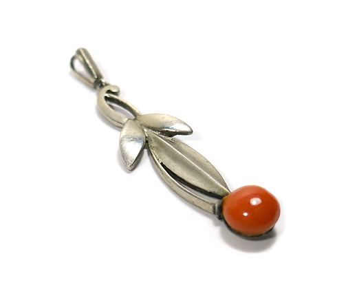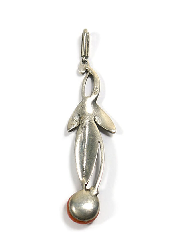 Figürlicher Silberkorpus (935er) in Form eines leicht stilisierten, dreifingrigen Blattes. Ein aus dem Zentrum dieses Blattes erwachsender, leicht geschwungener Steg trägt an seinem Ende eine abgeflachte, lachsrote Korallenperle, fixiert auf einer rückseitigen, flachen Scheibe. Oberseitig schlichte, bewegliche Anhängeröse. Gesamtlänge mit Öse ca. 4,8 cm , Korallendurchmesser ca. 0,7 cm, ungeputzter Zustand mit leichter Patina und geringen Tragespuren. Ungemarkt, wohl Deutschland der 1920er, 30er Jahre.