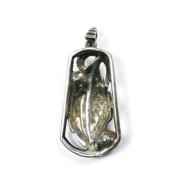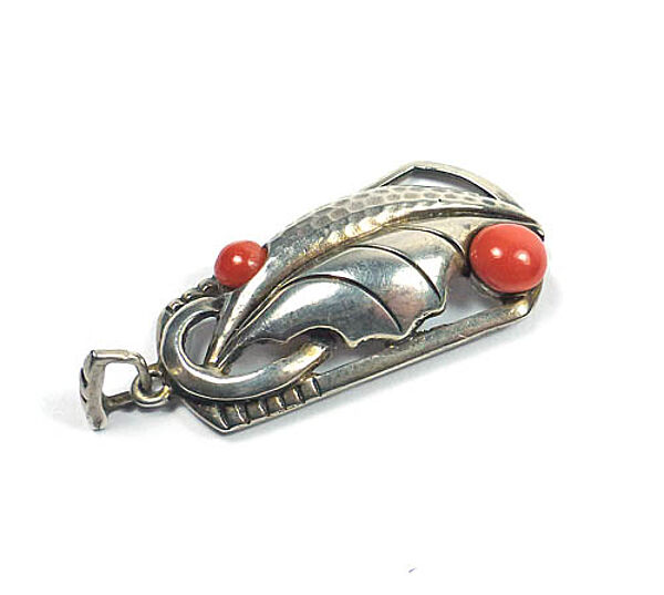 Halbplastisch, z.T. offen gearbeiteter Silberkorpus (835): ein sich nach oben verjüngender, schmaler Rahmen bildet das Gerüst für ein stilisierten Blatt, im Randbereich sind zwei Korallenperlen integriert. Oberseitig längliche, bewegliche Öse. Länge ohne Öse 3,2 cm, Länge mit Öse ca. 4 cm, Breite ca. 1,9 cm. Ungeputzter Zustand mit diskreter Patina und leichten Tragespuren. Ungemarkt, wohl Deutschland (Bielefeld?) der 1920er, 30er Jahre.
