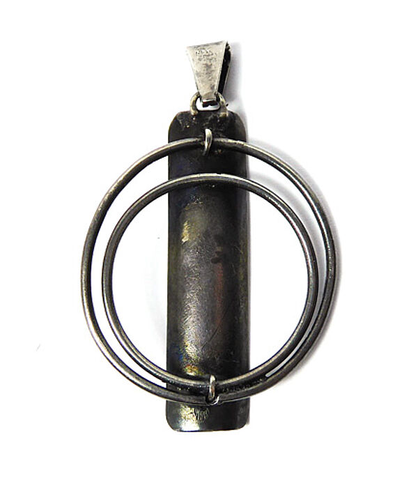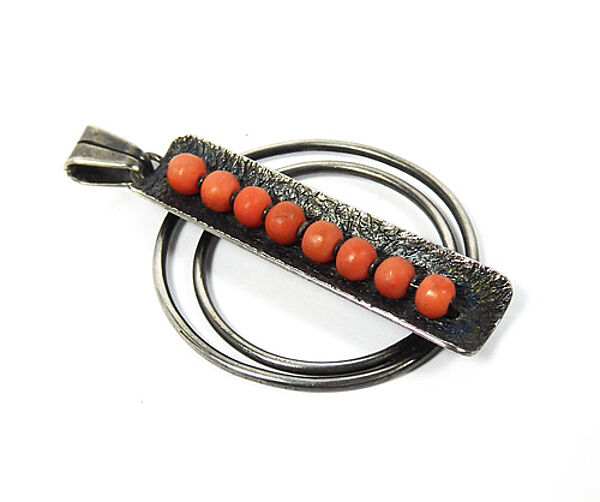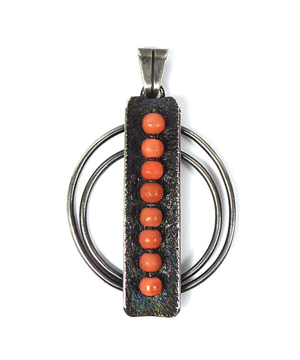 Konstruktiv aufgefasster Silberkorpus (835er), der durch ein bandförmiges, konkav gemuldetes Element dominiert wird, auf dem 8 gelochte, lachsfarbene Korallenperlen aufgezogen sind. Hinterlegt wird es durch zwei unterschiedlich große Ringelemente. Oberseitig bewegliche, annähernd dreieckig konfigurierte Öse. Maße ca. 5,3 x 3,3 cm, ungeputzter Zustand mit fast gleichmäßiger, dunkler Patina, geringe Tragespuren. Ungemarkt, wohl Deutschland der 1920er bis 40er Jahre.