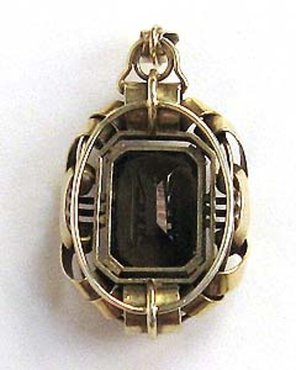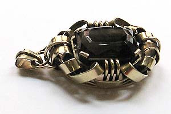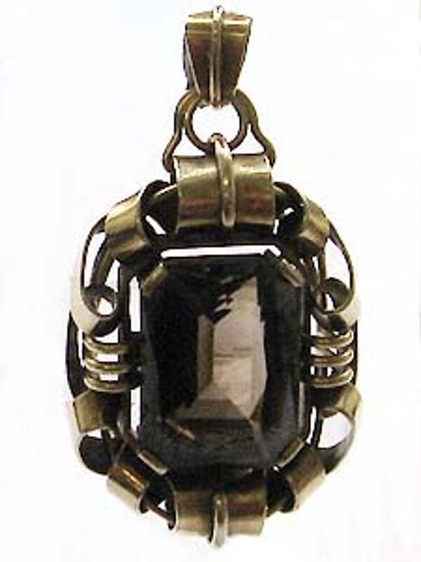 Der oppulente, offen gearbeitete Korpus aus vergoldetem Silber (835er) hat eine annähernd rechteckige Grundform mit abgerundeten Ecken und setzt sich aus mehreren schlaufen- bzw. volutenartigen Elementen zusammen, die zentral einen facettierten Rauchtopas (ca. 2,5 x 1,7 cm) in Zargenfassung tragen. Kräftige, sich nach oben verbreiternde Öse. Länge ca. 5,9 cm, Breite ca. 3,1 cm, minimale Gebrauchsspuren. Ungemarkt, wohl Deutschland der 20er Jahre.