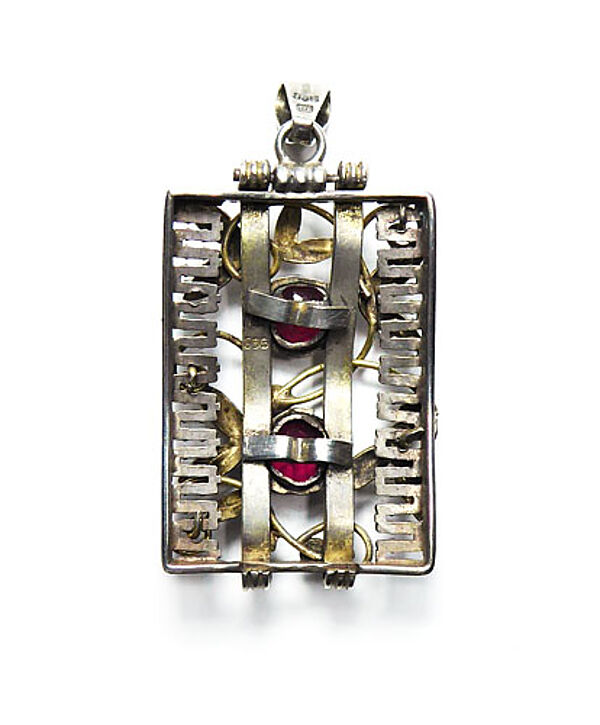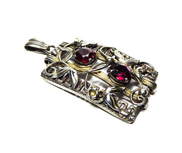 Offen gearbeiteter Silberkorpus (835er) aus dichten feinen Stegen, vorderseitig aufgestzt sind stilisierte, halbplastische florale Elemente, sowie zwei faszettiert geschlieffene rote Schmucksteine (Granate?) in Krappenfassung. Oberseitig einfache, bewegliche Anhängeröse, gemarkt, 2 geschliffene rote Schmucksteine, bewegliche Öse. Maße ca. 3,8 x 2,5 cm, Länge mit Öse ca. 5 cm