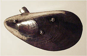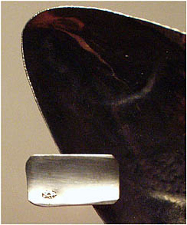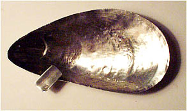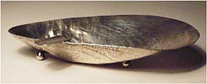 Handgearbeiteter Silberkorpus (nicht gepunzt, aber geprüft) in fein bzw. realistisch ausgearbeiteter Muschelform auf drei Kugelfüßen. Asymmetrisch aufgebrachte Zigarettenablage; Länge ca. 11 cm, Höhe ca. 2 cm. Ungeputzter Zustand mit leichter Patina. Ungedeutete Markung (5-eckiger Stern bzw. Davidstern). Evtl. Israel der 1950er Jahre?