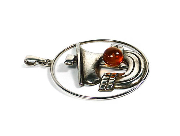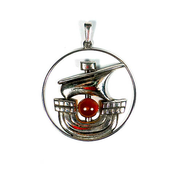 Runder, offen gearbeiteter Silberkorpus (835er): ein schmaler Steg umschließt die stilisierte Darstellung einer Kogge im Flachrelief, an deren Mast eine luzide, orange-braune Bernsteinperle fixiert (gestiftet) ist. Oberseitig schmale, bewegliche Öse. Durchmesser ca. 4,4 cm, Anhängerlänge mit Öse ca. 5,5 cm, geringe Tragespuren. An der Öse gemarkt, wohl 1950er Jahre.