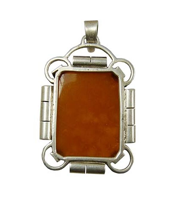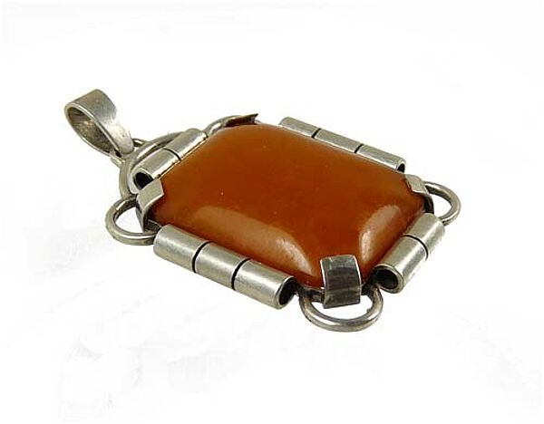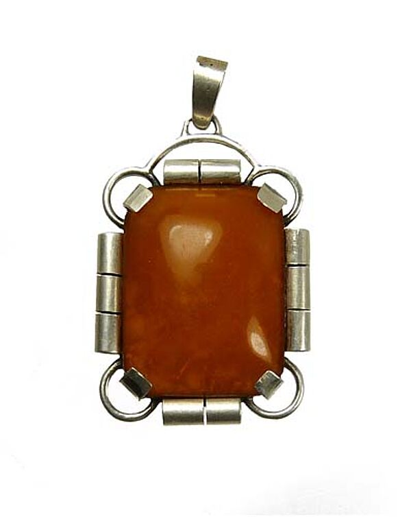 Annähernd rechteckiger, hinten offen gearbeiteter Silberkorpus (835er), dem an den Längsseiten fein geschlitzte Röhren- sowie an den Ecken zarte Bogenelemente aufsitzen und der zentral einen rechteckig gemugelten, orange-farbenen, überwiegend opaken Bernstein-Cabochon in kombinierter Zargen- und Krappenfassung trägt. Oberseitig, an einem weiteren Bogenelement fixierte, angedeutet dreieckig konfigurierte Öse. Länge mit dieser ca. 4,2 cm, ohne Öse ca. 3,6 cm, Cabochonmaße ca. 2,3 x 1,8 cm. Geputzter Zustand mit geringen Tragespuren. Wohl Deutschland der 20er, 30er Jahre.