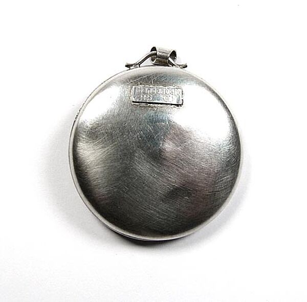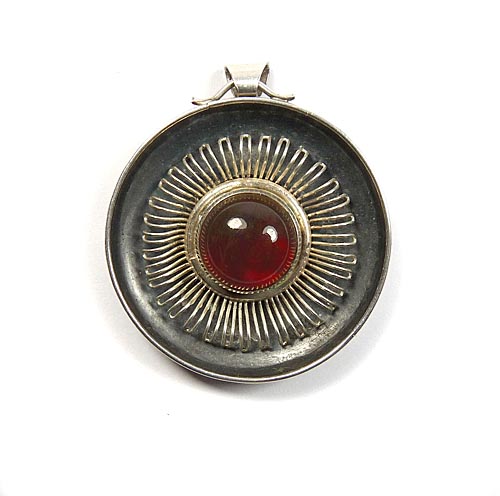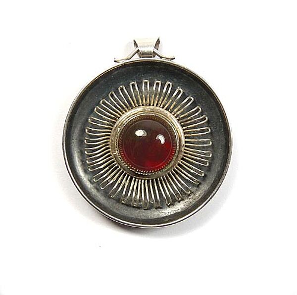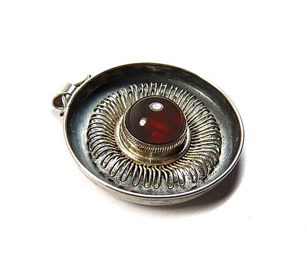 Schalenförmiger Silberkorpus (925er), der zentral einen bräunlichen, luziden Bernstein-Cabochon in dominanter Zargenfassung trägt, der von einem Kranz feiner, doppelläufiger, konvex gebogener Silberdrähte umgeben ist. Oberseitig flach anliegende, starre Öse aus Silberdraht, die eine kräftige, sich nach unten verjüngende, bewegliche Öse fixiert. Durchmesser ca. 3,9 cm, Länge mit Öse ca. 4,5 cm. Ungeputzter Zustand mit vor allem vorderseitig z.T. recht dunkler Patina. Leichte Tragespuren. Rückseitig auf kleinem Silberplättchen Markung und Bezeichnung "Handarbeit".