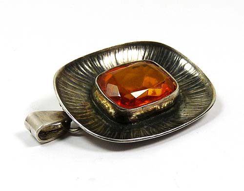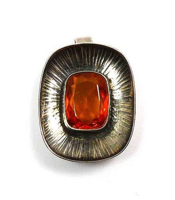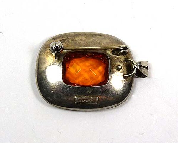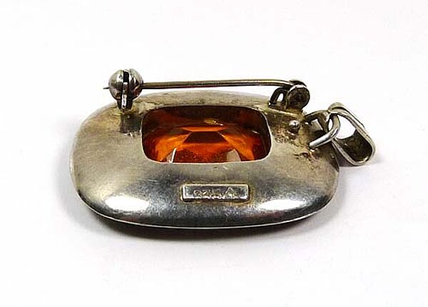 Der annähernd rechteckige, rückseitig z.T. offen gearbeitete, schalenförmig gemuldete Silberkorpus (835er) mit stark abgerundeten Ecken trägt mittig einen facettiert geschliffenen, orange-braunen, luziden Bernstein in Zargenfassung und weist ansonsten ein strahlenförmiges, feines Streifendekor auf. Länge mit dieser ca. 3,8 cm, Länge ohne Öse ca. 3,3 cm. Ungeputzter Zustand mit moderater Patina und geringen Tragespuren. Rückseitig befinden sich oberseitig eine annähernd dreieckig konfigurierte, relativ kräftige, sich nach unten leicht verjüngende, bewegliche Öse sowie entlang der langen Kante eine Sicherheitsbroschierung mit Kugelkopf. Hier auch Markung, wohl 1930er, 40er Jahre.