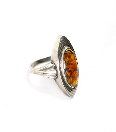 Der relativ leichte, silberne Korpus (835er) setzt sich zusammen aus einer sich zur Ringschulter erweiternden, hier fächerartig gegliederten Schiene und einem spindelförmigen Kopf mit geprägtem Liniendekor, welcher einen bräunlichen, luziden, ovalen Bernstein-Cabochon in Zargenfassung trägt. Innendurchmesser ca. 1,8 cm, ungeputzter Zustand mit geringen Tragespuren. Ungemarkt, wohl Deutschland der 20er, 30er Jahre.