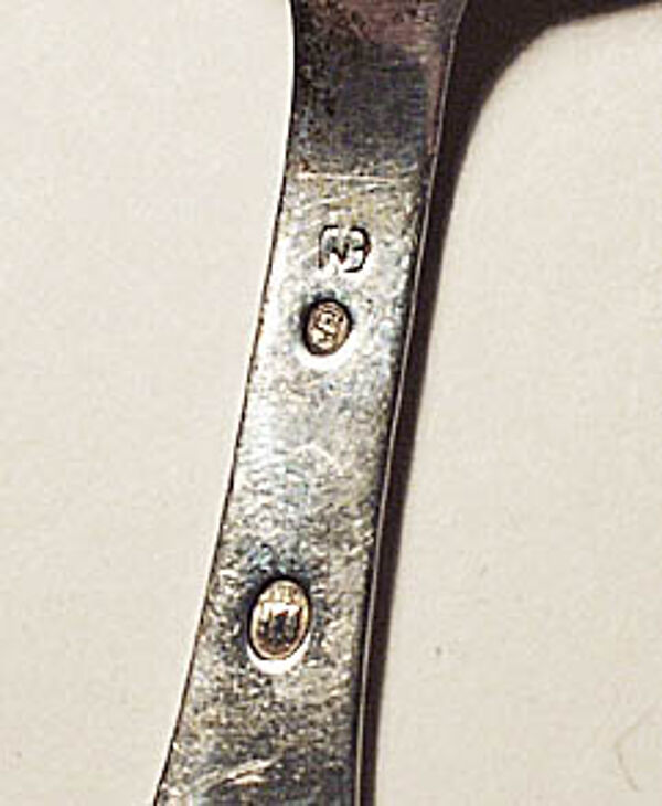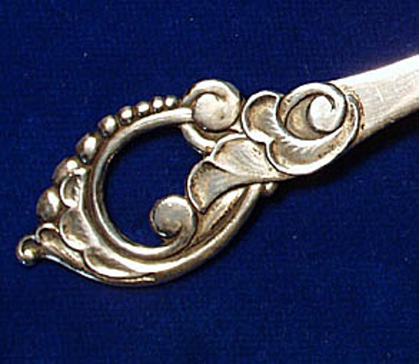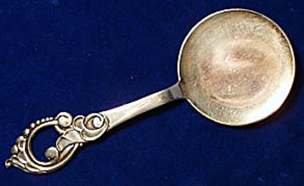 Der Löffel hat eine Länge von ca. 13,5 cm, sein Stielende weist ein stilisiertes, reliefiertes, durchbrochen gearbeitetes, florales Dekor auf. Rückseitig kann man die dänische Silberpunze (3 Türme, hier auch Herstellungsjahr 1938) sowie zwei Marken ("EM" und eine ungedeutete) erkennen. Ungeputzter Zustand mit geringen Gebrauchsspuren.
