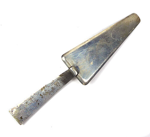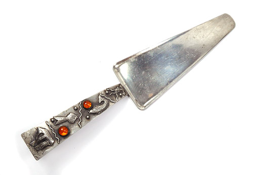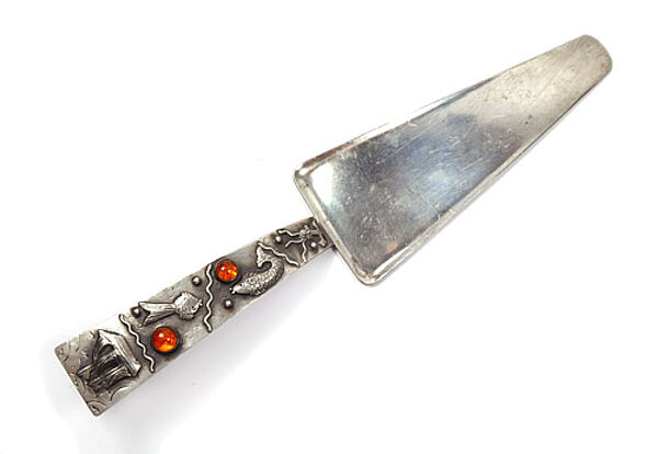 Korpus aus getriebenem und gedrücktem Silber (835er), Handhabe mit aufgesetzten Schiff-, Fisch- und Wellenmotiven, zudem zwei Bernstein-Cabochons in Zargenfassung. Rückseite mit gepunztem Strich- und Kreisdekor, hier auch Markung "GK" (= Georg Kramer) sowie Nr. "T 9". Länge ca. 21 cm, ungeputzter Zustand mit leichter Patina und geringen Gebrauchsspuren. Wohl zwischen Ende der 1930er und 1950er Jahre.