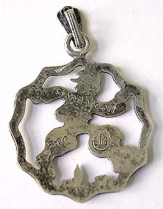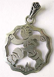 Annähernd runder, am Rand gewellter, diskret gewölbter Silberkorpus (800er) mit ausgesägtem und teilweise gepunzten Motiv eines Jungen, der vermutlich mit Siebenmeilenstiefeln, auf jeden Fall mit riesen Schritten in die Welt hinauszieht und sein kleines, vielleicht zu enges Dorf hinter sich zurück läßt. Durchmesser ca. 2,5 cm, ungeputzter Zustand mit partiell vorhandener Patina bzw. geringen Gebrauchsspuren. Rückseitig gemarkt (ungedeutet) und bezeichnet: "Handarbeit", wohl Deutschland der 20er oder 30er Jahre.