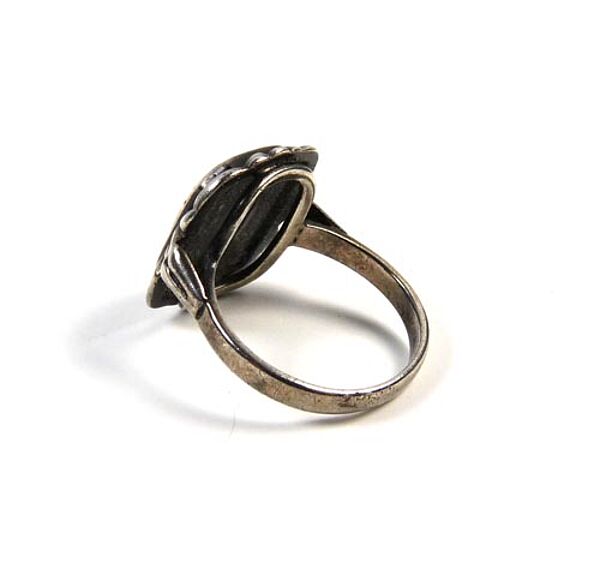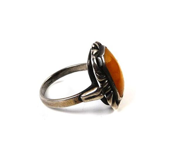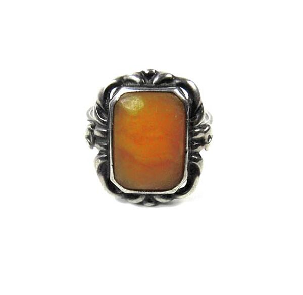 Silberner Korpus (835er oder 935er, Punze etwas verschlagen) aus einfacher Schiene und dominantem, im Randbereich schweifartig verzierten Kopf, der einen opaken, orange-braunen, annähernd rechteckig konfigurierten Bernstein-Cabochon in Zargenfassung trägt. Maße ca. 1,5 x 1,8 cm, Ringinnendurchmesser ca. 1,8 cm, ungeputzter Zustand mit leichter Patina und moderaten Trage- bzw. am Bernstein auch leichten Kratzspuren. Ungemarkt, wohl Deutschland der 20er, 30er Jahre.