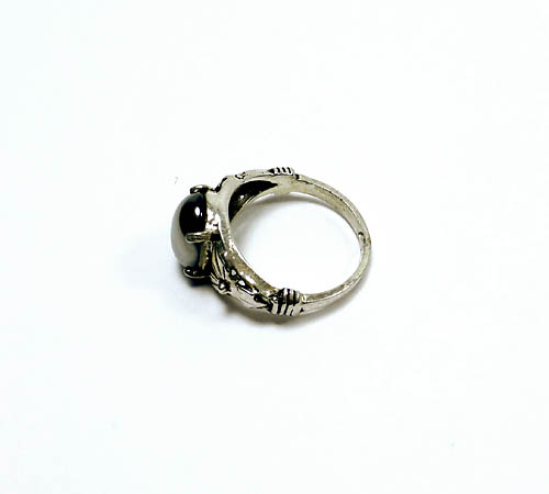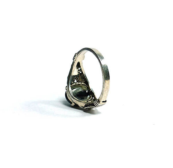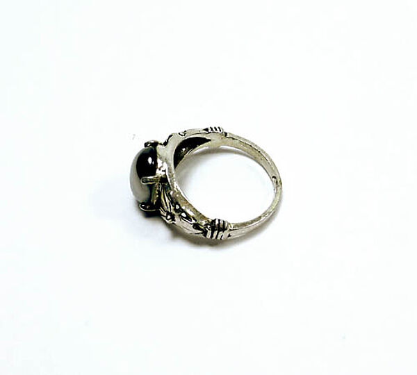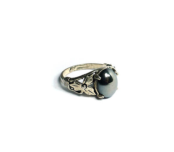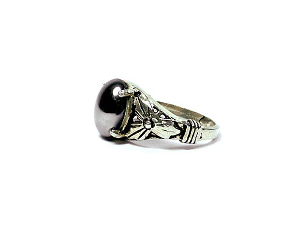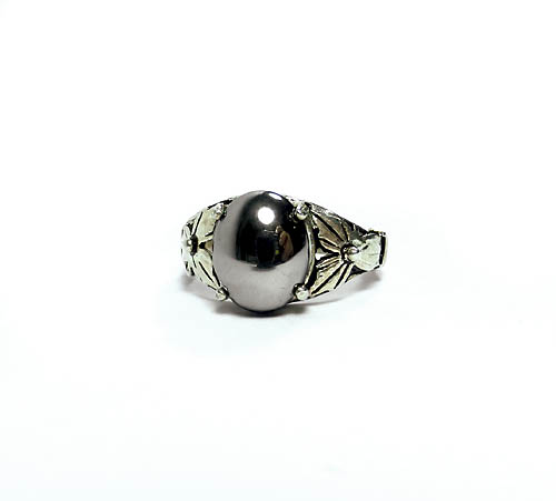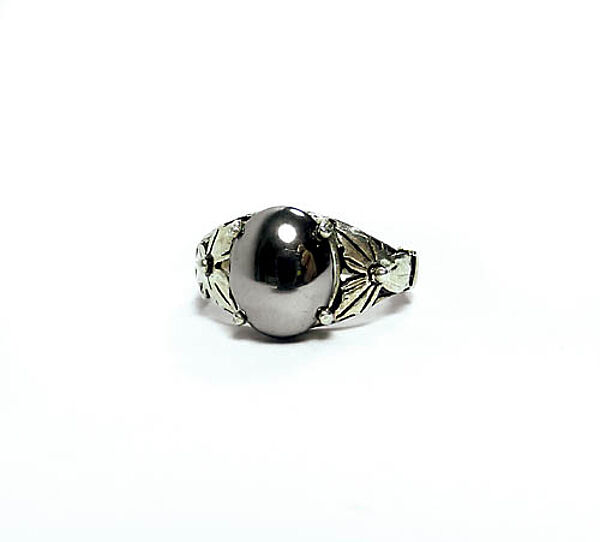 Silberner Korpus (925er) aus einfacher Schiene, durchbrochener, halbplastischen Schulterbereichen in Form stilisierter Blüten und einem ovalen Hämatit-Cabochon in Krappenfassung als Kopf (ca. 1 x 0,8 cm), Ringinnendurchmesser ca. 15 mm. Ungeputzter Zustand mit leichter Patina und geringen Trage- bzw. Altersspuren. Ungemarkt, wohl Deutschland der 1920er, 30er Jahre.
