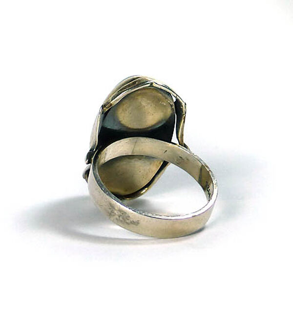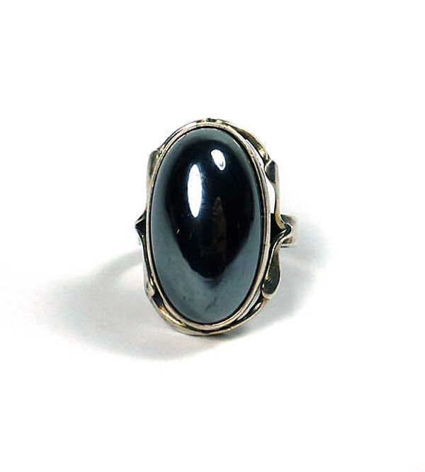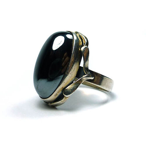 Silberner Korpus (925er) mit einfacher Ringschiene aud die beidseits flügelartige Schulterelemente aufsetzen, die in ein leicht gewelltes Band an der Basis des ovalen Ringkopfes übergehen. Dieser wird durch einen dominanten Hämatit-Cabochon in Zargenfassung gebildet. Abmessungen des Ringkopfes ca. 2 x 1,3 cm, Ringdurchmesser ca. 17 mm, ungeputzter Zustand mit minimaler Patina und geringen Tragespuren. Innenseitig gemarkt, Entwurf vermutlich 1930er Jahre von Toni Riik, Ausführung evtl. später.
