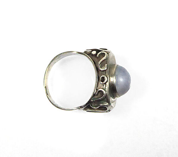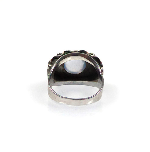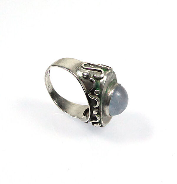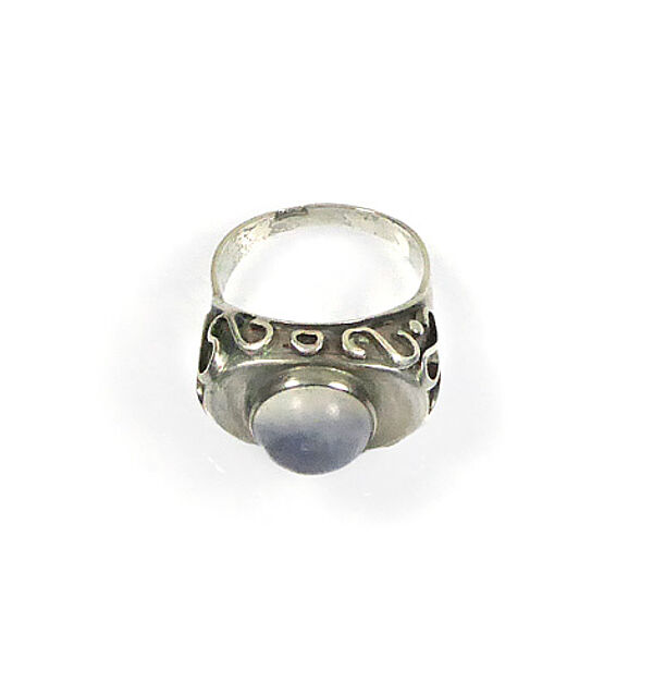 Silberner Korpus (wohl 900er, Punze etwas verschlagen) mit einfacher Schiene und ovalem Kopf, der mit vielen kleinen punkt- und wellenförmig geformten Stegen besetzt ist und von einem runden Mondstein-Cabochon in Zargenfassung dominiert wird. Dieser weist einen Durchmesser von ca. 10 mm auf, Ringbreite ca. 2 cm, Ringinnendurchmesser ca. 17,2 mm. Ungeputzter Zustand mit geringer Patina und leichten Alters- bzw. Tragespuren. Wohl Deutschland der 1920er, 30er Jahre.