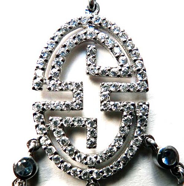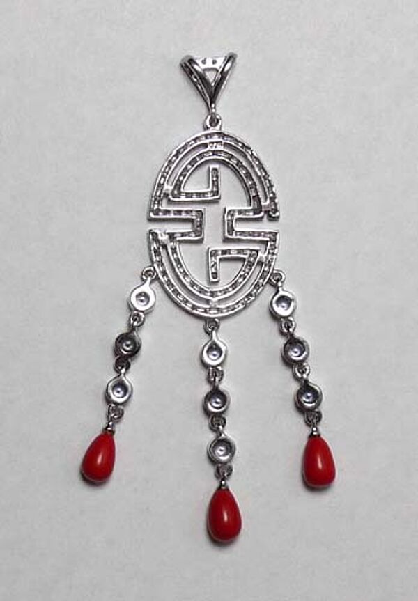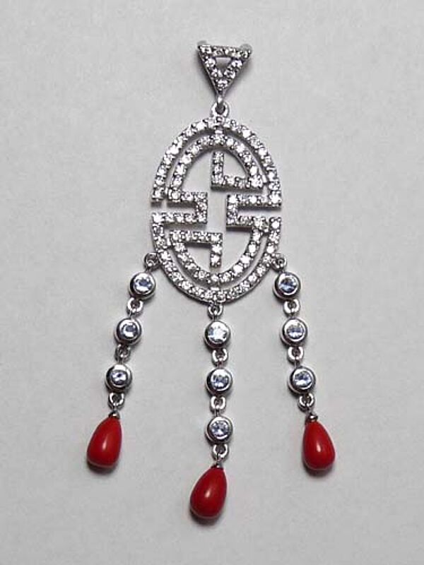 Der offen gearbeitete Silberkorpus (925er) wird durch ein strassbesetztes Bandelement gebildet, welches außen ovalär und zentral mäanderartig verzweigt verläuft. Im untren Anteil drei abgehängte Ketten mit jeweils drei geschliffenen Glassteinen (oder Bergkristallen) in Zargenfassung, die je mit einer tropfenartig geschliffenen Korallenperle abschließen. Oberseitig dreiechig konfigurierte, ebenfalls strassbesetzte Öse. Länge ca. 7,2 cm, minimale Gebrauchsspuren. Wohl 1920er bis 50er Jahre.