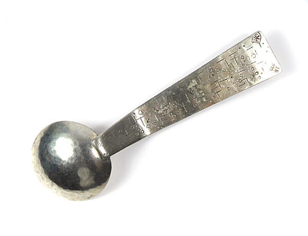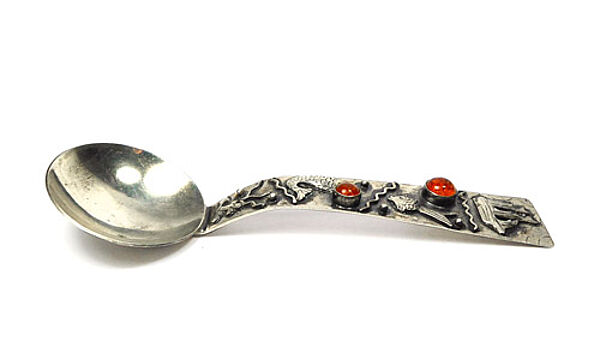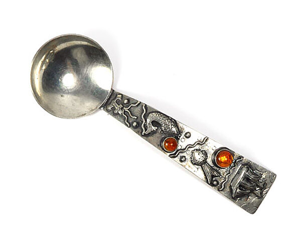 Korpus aus getriebenem Silber (835er), Handhabe mit aufgesetzten Schiff-, Fisch- und Wellenmotiven, zudem zwei Bernstein-Cabochons in Zargenfassung. Rückseite mit gepunztem Strich- und Kreisdekor, hier auch Markung "GK" (= Georg Kramer) sowie Nr. "26". Länge ca. 13,5 cm, ungeputzter Zustand mit leichter Patina und geringen Gebrauchsspuren. Wohl zwischen Ende der 1930er und 1950er Jahre.
