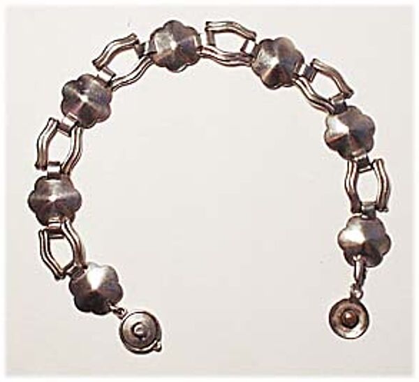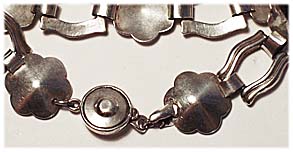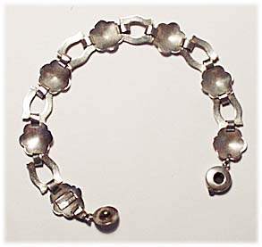 Armband aus 835er-Silber, bestehend aus 7 Gliedern in Form stilisierter Blumen, die sich jeweils abwechseln mit 6 Gliedern in Form parallel verlaufender, leicht konvex geschwungener Stege. Seltener, patentierter Druckknopfverschluß (D.R.G.M). Länge ca. 20,5 cm, geringe Gebrauchs- bzw. Putzspuren. Das Armband ist gemarkt (ungedeutet) sowie bezeichnet mit "Handarbeit", wohl Deutschland der 20er Jahre.