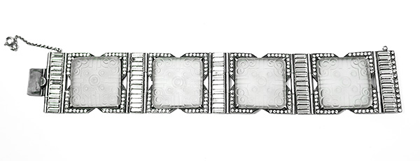 Aufwendiges Gliederarmband aus Silber (835er), wobei vier größere, rechteckige Glieder dominieren, die jeweils eine Krappen-gefasste Pate de Verre-Platte mit abgerundeten Ecken und oberseitig flach reliefiertem abstrakten Dekor tragen. Umrahmt werden diese jeweils von einer Reihe feiner Strass-Steine. In Höhe der Glasplatten ist das Armband rückseitig jeweils offen gearbeitet. Fünf bandförmige Zwischenglieder (mit schmalen Scharniergelenken untereinander verbunden) geben dem Armband eine gute Beweglichkeit. Diese tragen oberseitig jeweils eine Reihe länglicher Strass-Steine. Zungenförmiger Federverschluss mit Sicherheitskettchen. Das Armband ist ca. 18,5 cm lang und ca. 3,2 cm breit, ungeputzter Zustand mit diskreter Patina und geringen Tragespuren. Am Verschluss signiert JAC (Holland), wohl 1940er bis 70er Jahre.