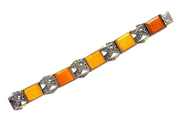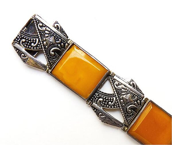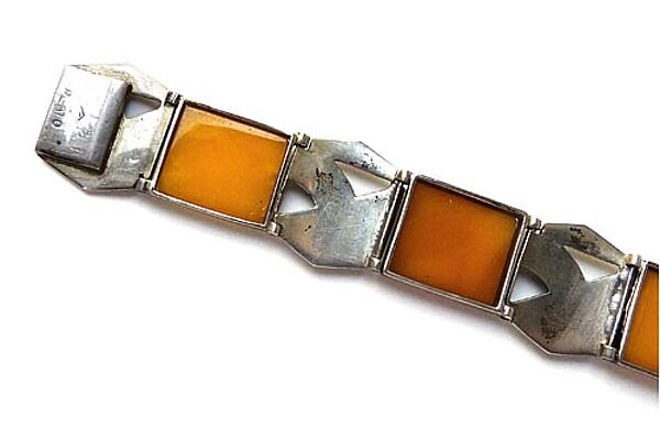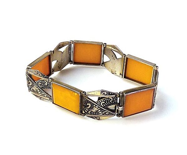 Silbernes (800er) Armband aus 5 jeweils rückseitig offenen, mit einem rechteckig gemugelten, zargengefassten, von hell-orange bis orange-bräunlichen, opaken Bernstein besetzten sowie 5 sechseckig konfigurierten, durchbrochen gearbeiteten Gliedern, die flach-reliefert ein abstraktes Muster aufweisen. Zungenförmiger Federverschluss. Länge ca. 20,3 cm, ungeputzter Zustand mit moderater Patina und geringen Tragespuren (zwei Bernsteine mit kleinen Chips). Ungedeutete Markung, wohl Deutschland der 20er Jahre.
