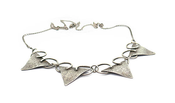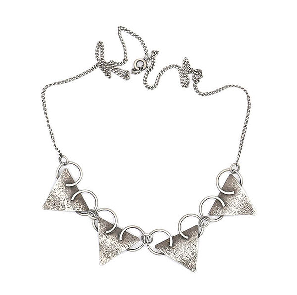 Silbernes Collier (835er) mit zentral 4 dreieckigen, vorderseitig fein punzierten Gliedern, die oberseitig jeweils zwei dominate Ringelemente aufweisen, die wiederum durch kleine Silberringe miteinander verbunden sind. Länge ca. 19 cm. Ungeputzter Zustand mit geringen Gebrauchsspuren. Wohl Deutschland der 20er Jahre.