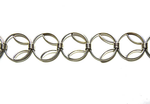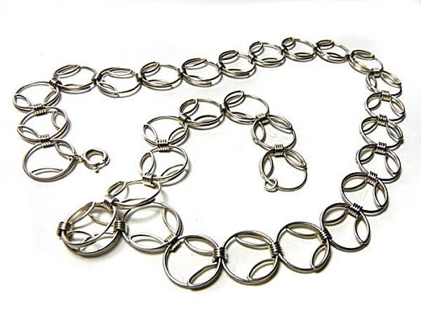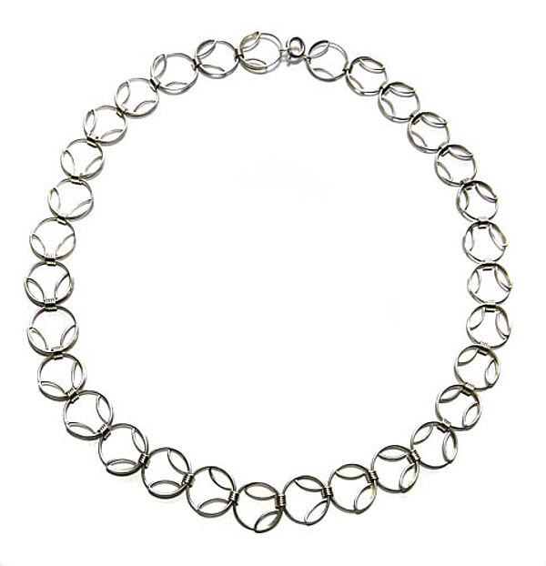 Kette aus Silber (835er, geprüft), die sich aus ringförmigen Gliedern zusammensetzt, die im Halbkreis doppelt verlaufen, bobei hier die Enden konkav zurücklaufen. Kleine, spiralförmige Zwischenglieder. Ringösenverschluss. Länge ca. 42,5 cm, geputzter Zustand mit minimalen Tragespuren. Ungemarkt, wohl Deutschland der 20er, 30er Jahre.